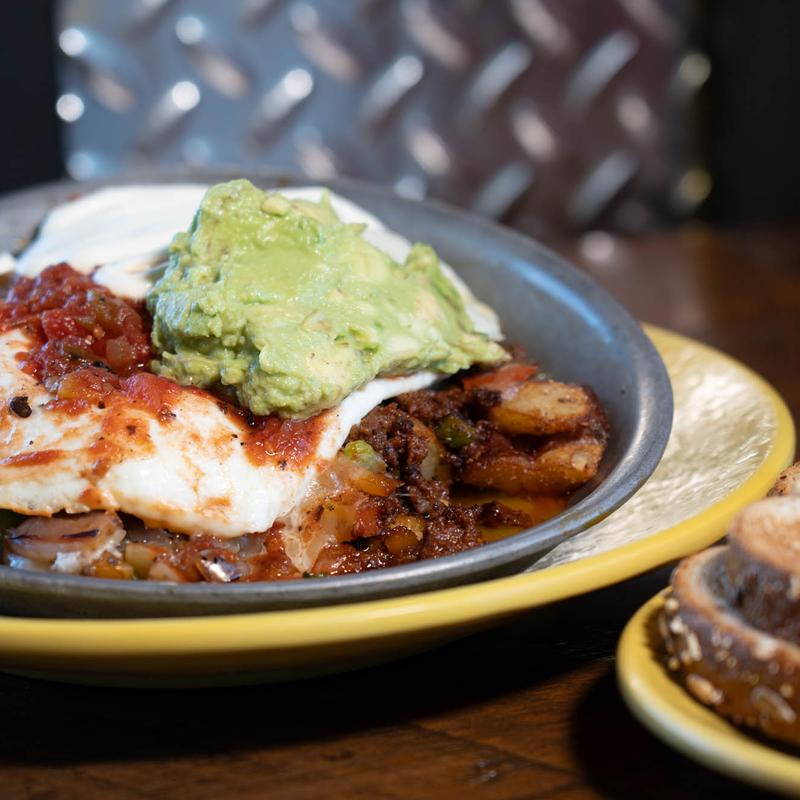 Chorizo, jack cheese and black beans over two crispy flour tortillas. Served with two eggs your way, roasted salsa and pico de gallo. Topped with sliced avocado, sour cream and shredded cheese.