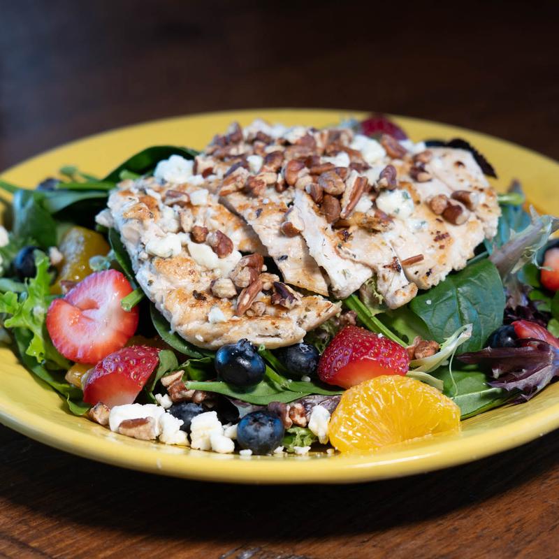 Your choice of grilled chicken or chicken salad; over mixed greens with strawberries, blueberries, mandarin oranges, blue cheese, and pecans. Served with poppy seed dressing.