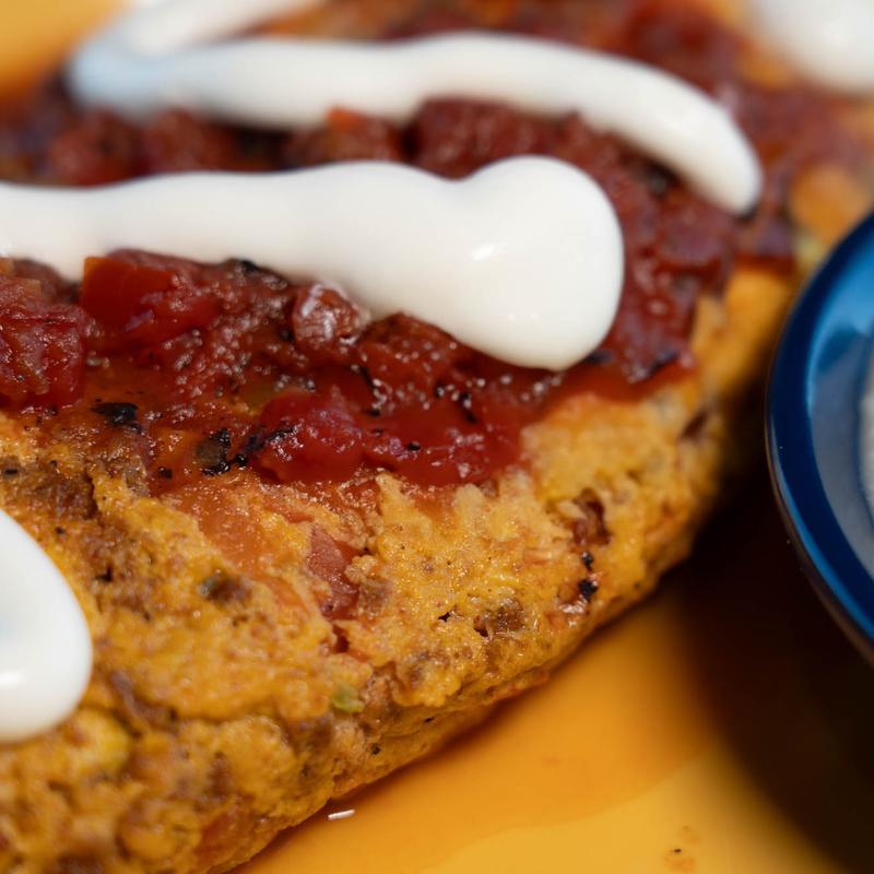 Chorizo, fresh sliced jalapeño, onions, tomatoes, green peppers, pepper jack cheese, topped with salsa and sour cream. Served with a side and toast or pancakes.