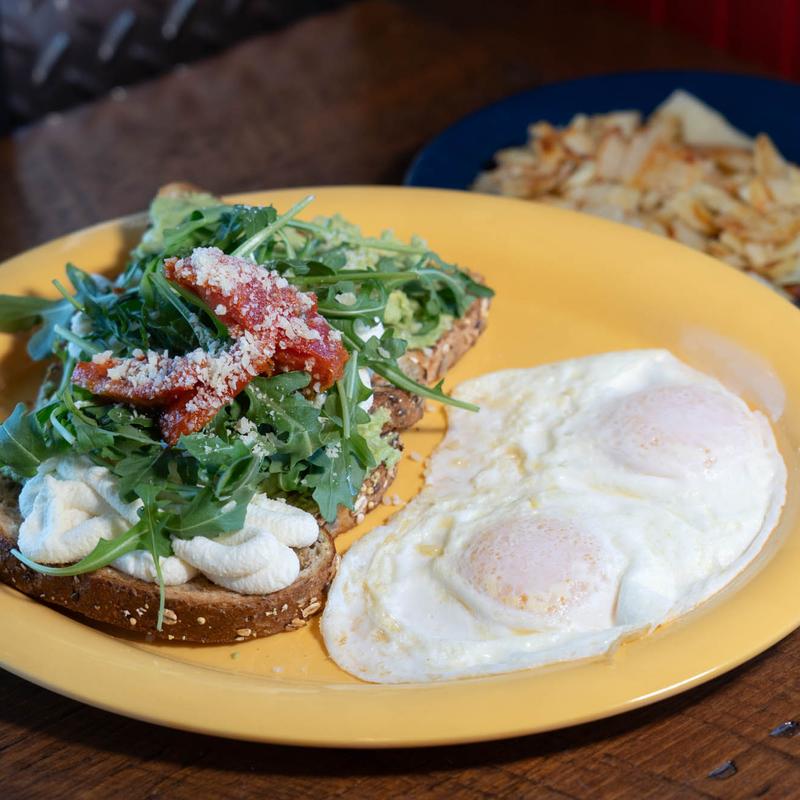 Whole grain toast with fresh mashed avocado, arugula, tomatoes, parmesan and ricotta. Served with two eggs any style.