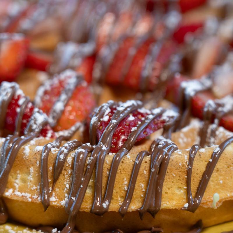 Crepes stuffed with fresh strawberries topped with a drizzle of strawberry cream cheese and dusted with powdered sugar.