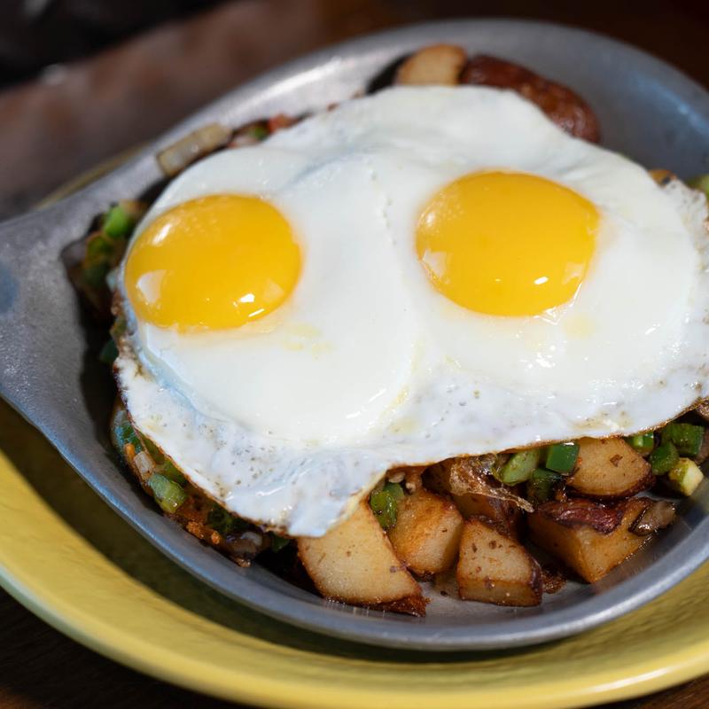 All served over Roasted Potatoes and topped with two eggs any style with your choice of toast or pancakes.